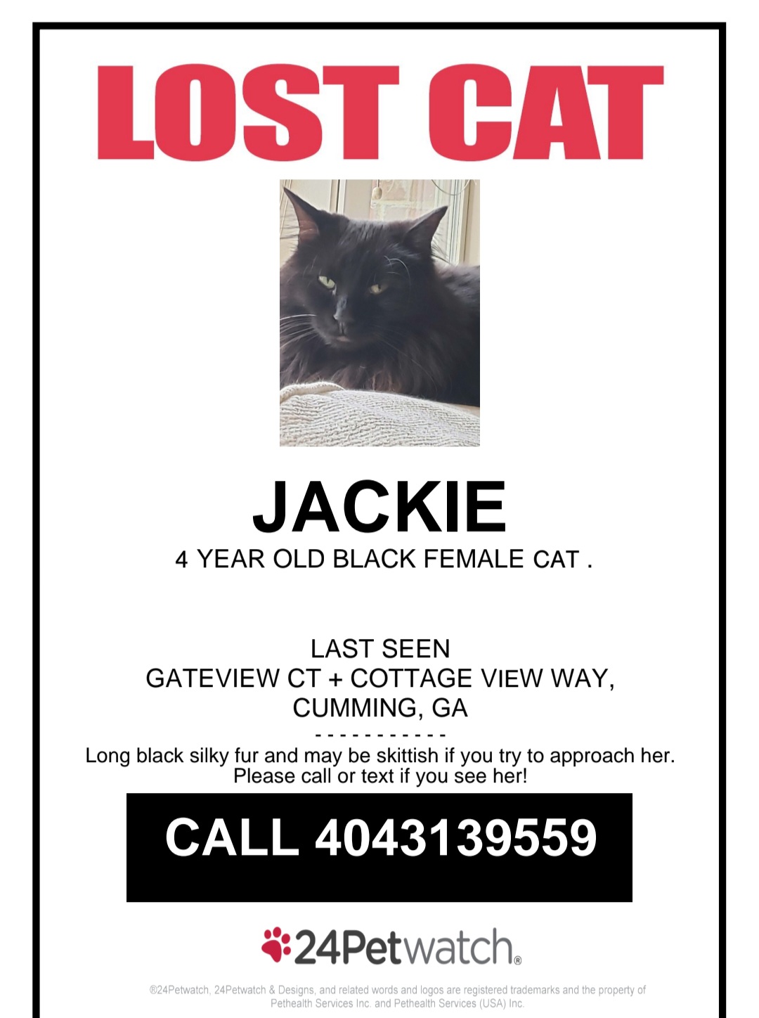 Please be on the lookout for Jackie. She is a beautiful black cat. She escaped from her home on Gateview Court last night. Call 404-313-9559 if you have any information on her.