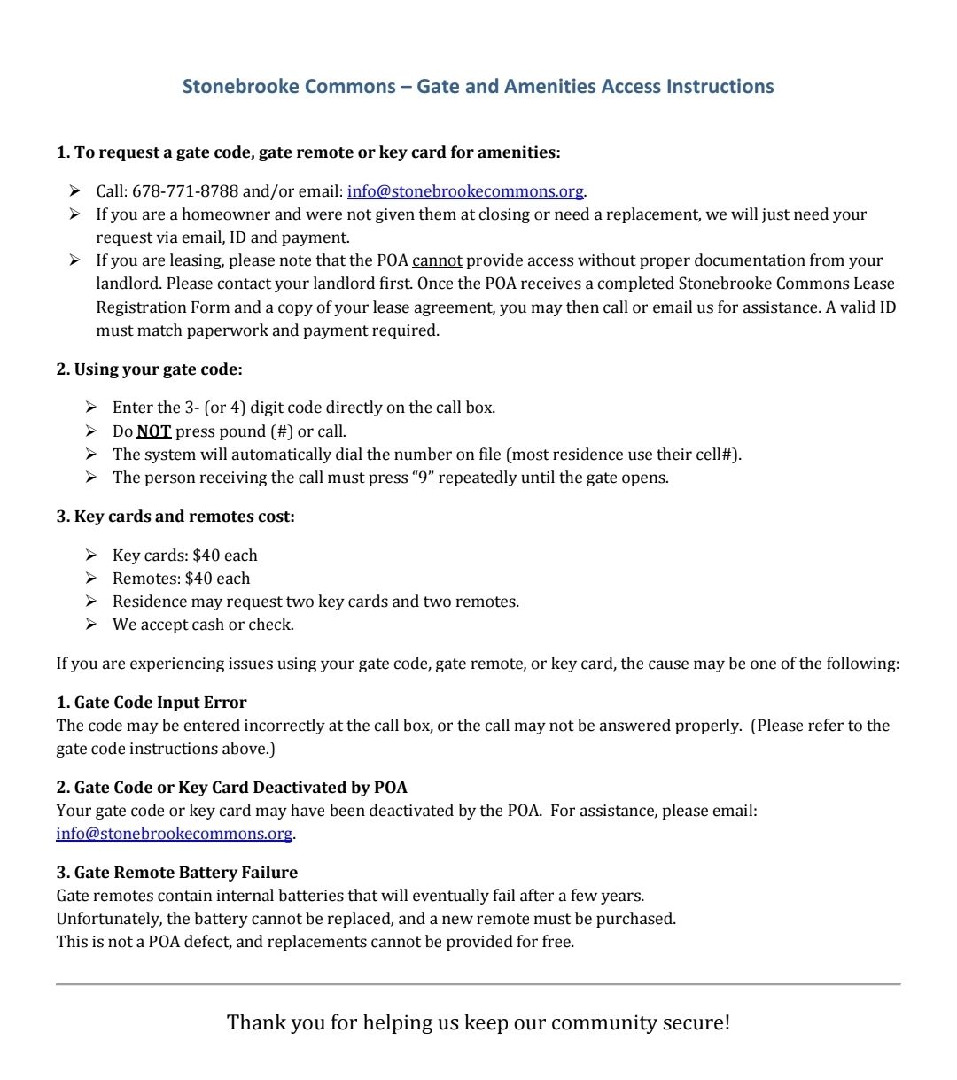 The Stonebrooke Commons amenities complex is secured by an electronic key card. Each residence is allowed two key cards. Cards are provided at a cost of $40 each. If you did not receive key cards at your closing, please contact: